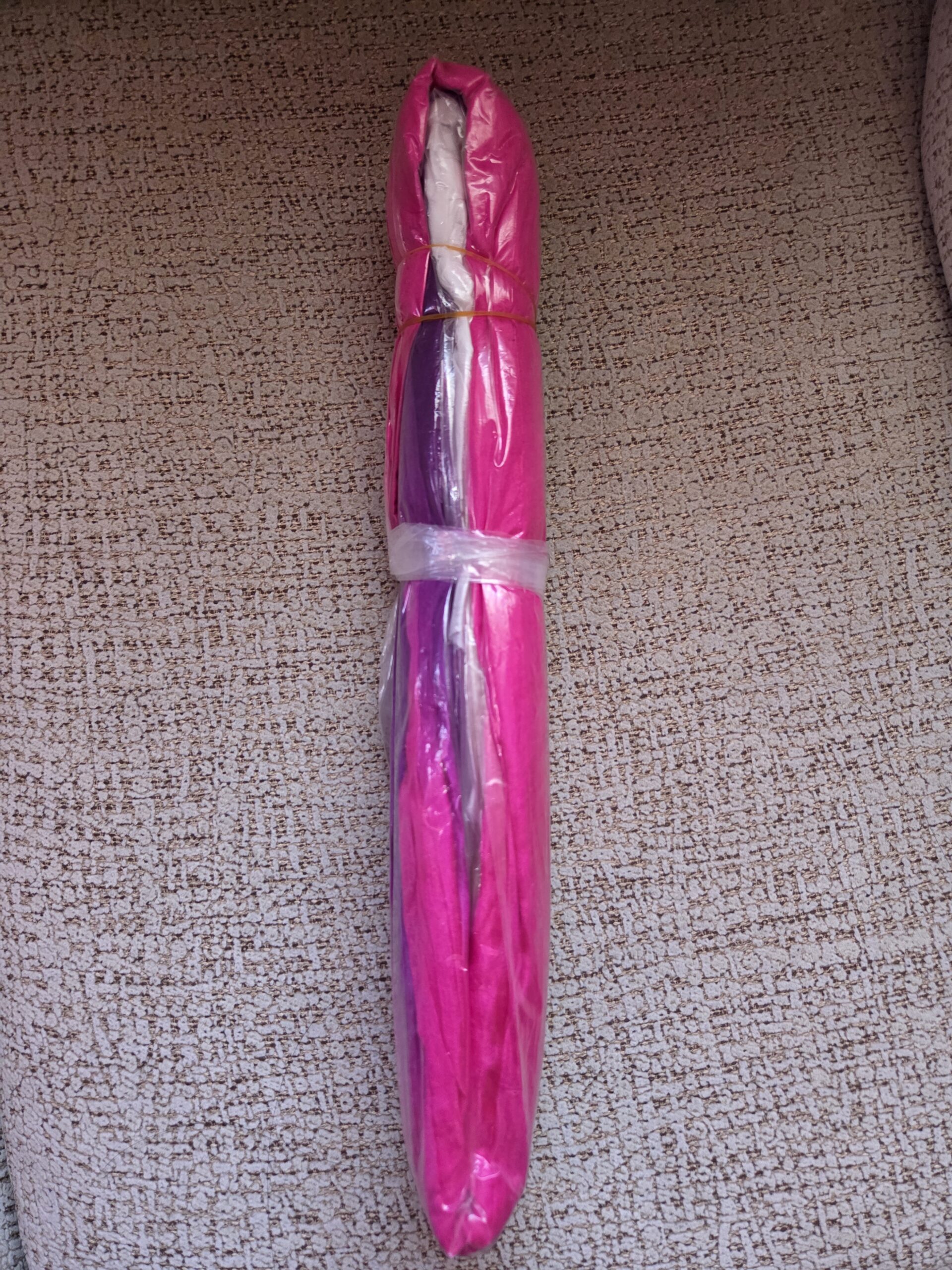 Abanico de seda color morado, fucsia y blanco.