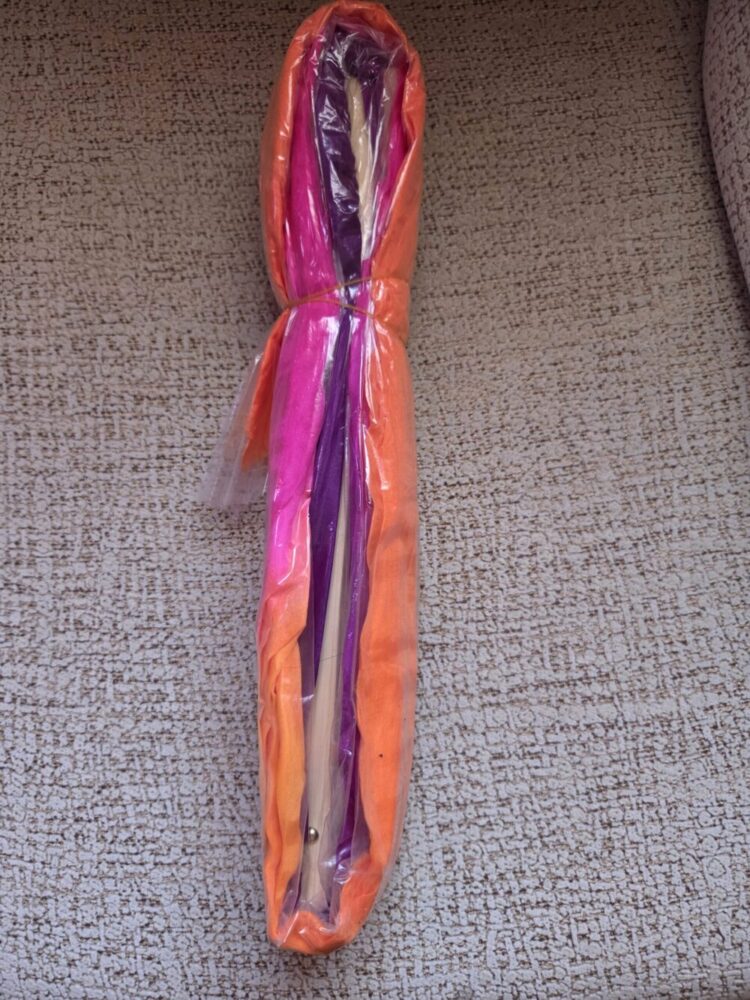Abanico de seda color naranja, fucsia y morado.