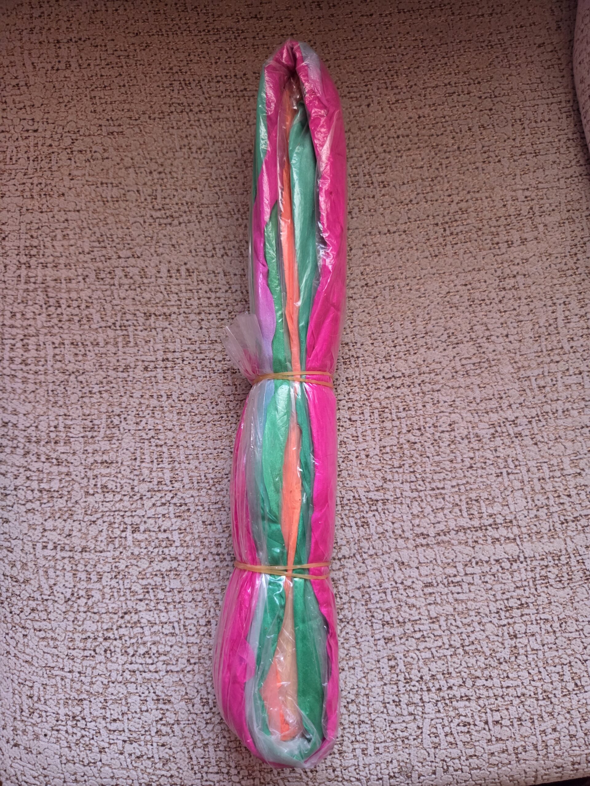 Abanico de seda color fucsia, naranja y verde